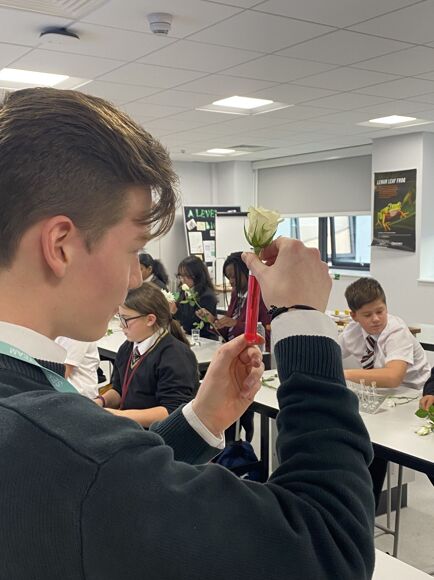 The Sixth Form students will be planning an experiment each week for the Year 7 and 8 students in the club to perform. Last week was the 'Magic Flowers' experiment, where students use the gravity-defying 'capillary action' of plants, along with water dyed in various colours, to change the colours of flowers' petals.