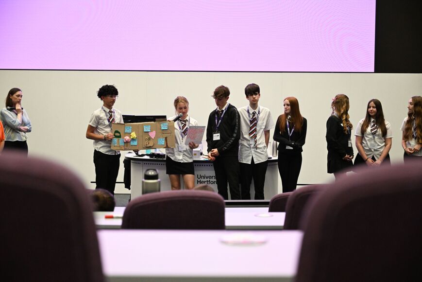 A large group of Year 9 students visited the University of Hertfordshire recently, for their interactive Pathfinder Day. The students formed small groups, each paired with a University student team leader, and through the day they worked together in various games and activities. Their work culminated in a craft activity, giving them the chance to demonstrate what they had learned about higher education and the student experience.