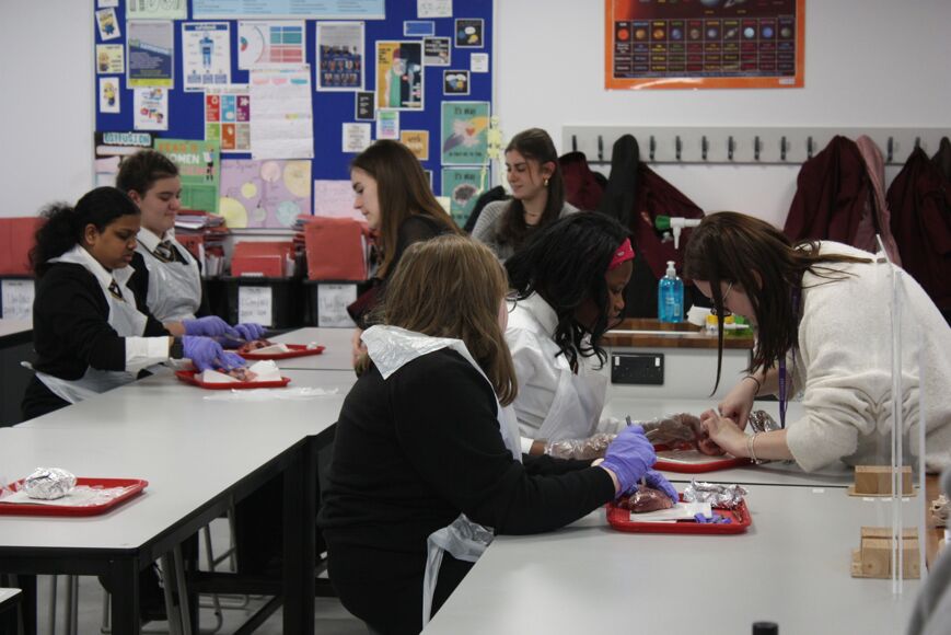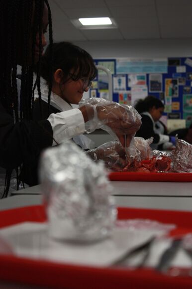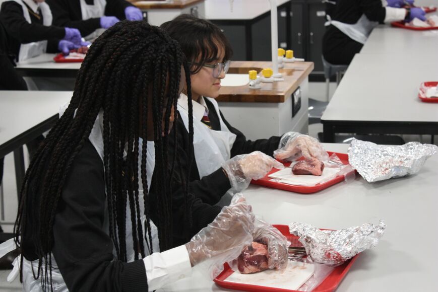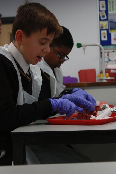 "During last week's Biology Club, the students dissected lambs' hearts, and tried to identify the four chambers of the heart: the right and left ventricles and atriums. We also asked the group to identify the major veins and arteries (vena cava, aorta, pulmonary vein and pulmonary artery), but that proved quite difficult!