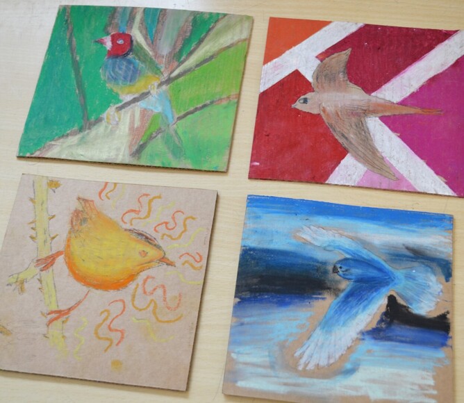 At last week's Outdoor Learning Day, Year 7 students worked on oil pastel studies of their House bird in their House colours. These were inspired by Leicester based artist Lucy Stevens, whose work explores our relationship and understanding of nature conservation.