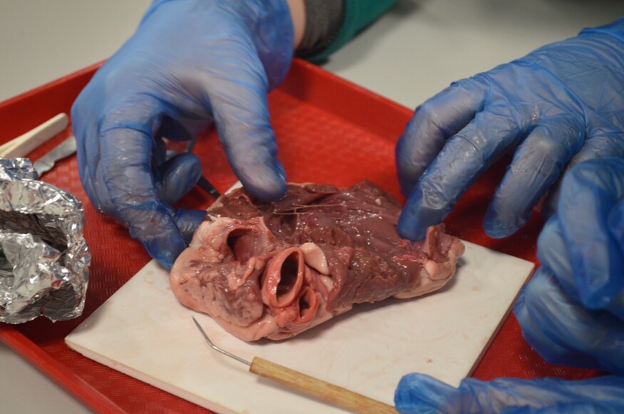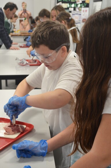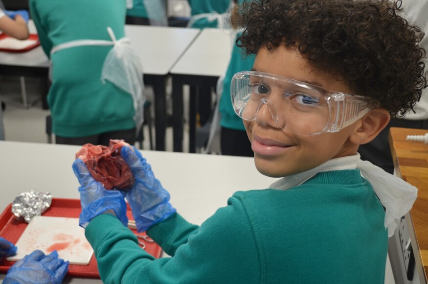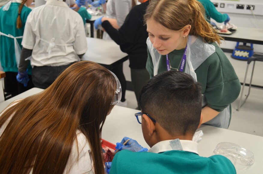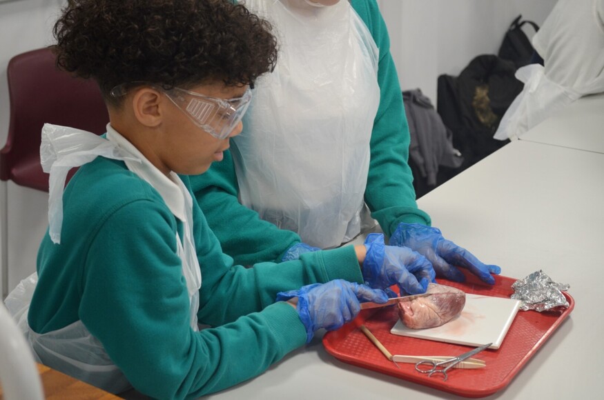 After a demonstration, learning the rules of a safe lab, and getting themselves equipped, the students started work on lamb hearts. With the support of A Level Biology students and some familiar-faced Year 7 Parkside alumni, they worked to identify the four chambers of the heart which ties into the theory they already learnt.