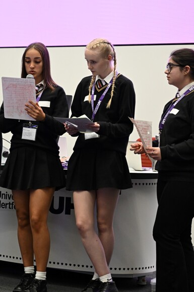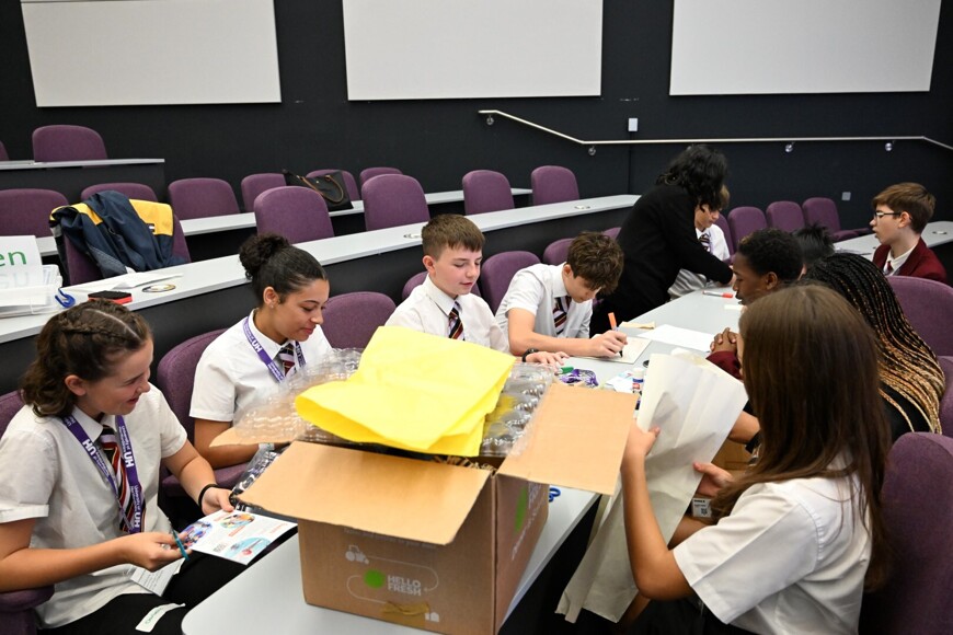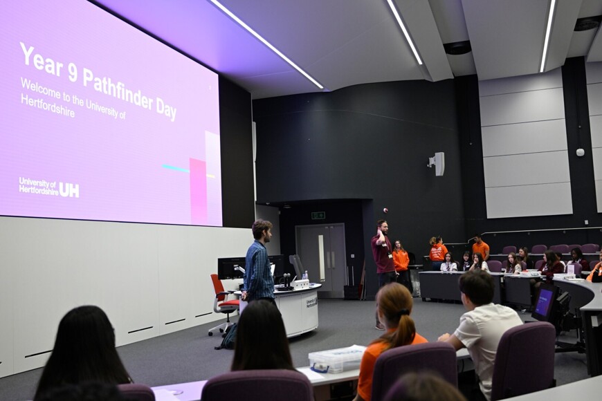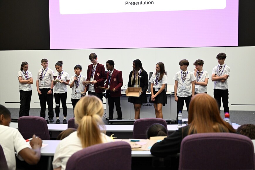 A large group of Year 9 students visited the University of Hertfordshire recently, for their interactive Pathfinder Day. The students formed small groups, each paired with a University student team leader, and through the day they worked together in various games and activities. Their work culminated in a craft activity, giving them the chance to demonstrate what they had learned about higher education and the student experience.