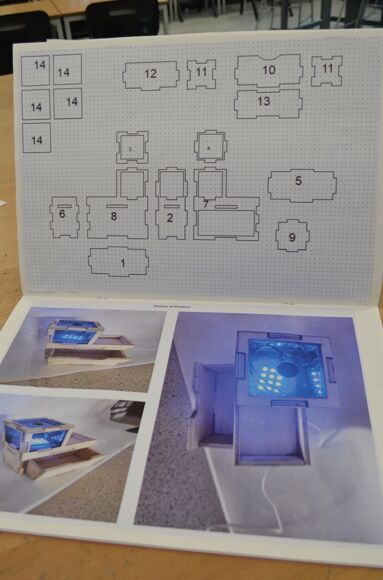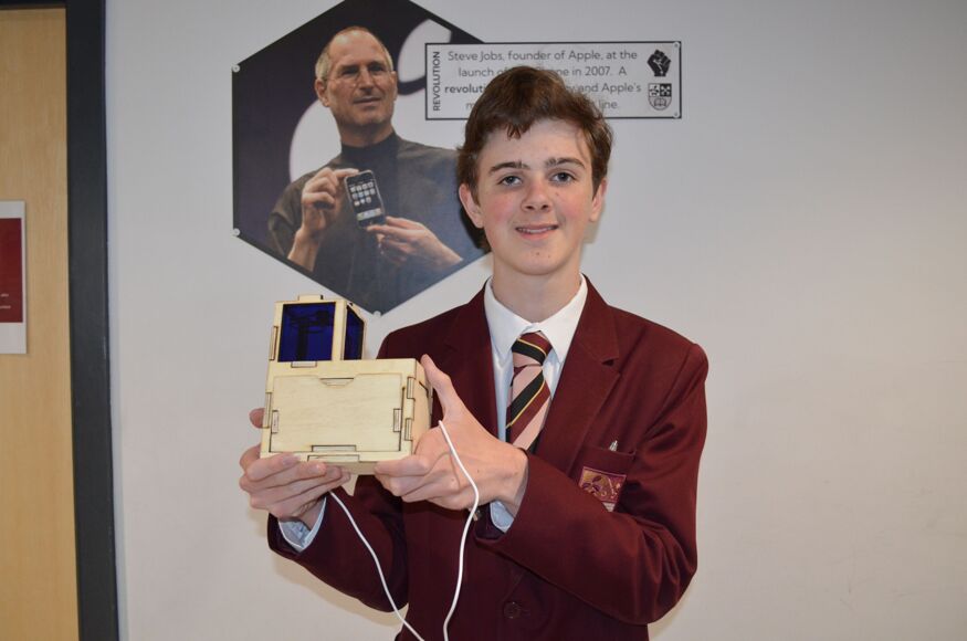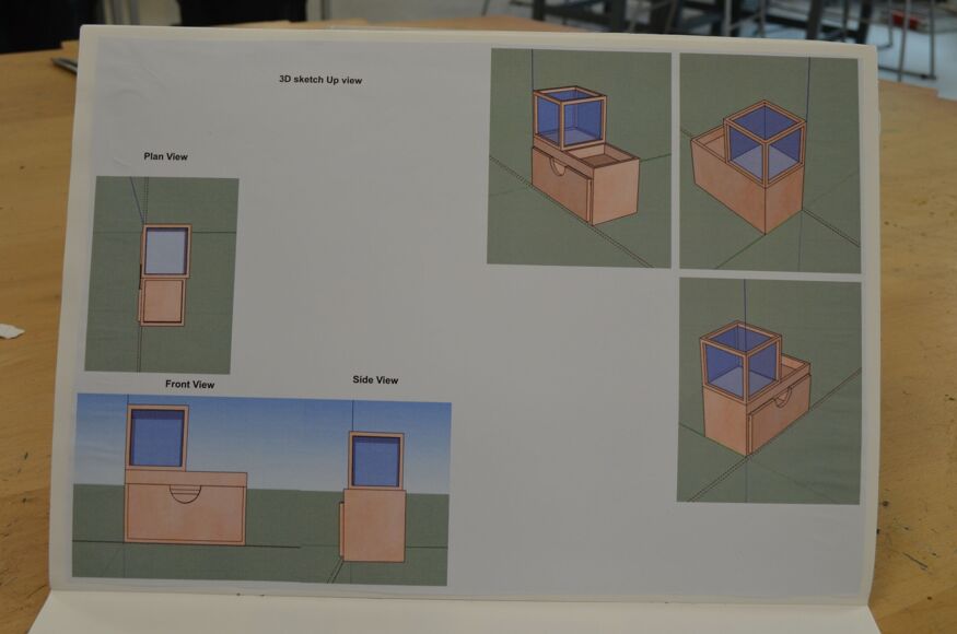 Monday's students are Gracjan and Hugh. Gracjan was ambitious, wanting a light suspended in the air. He designed and 3D printed a light frame, with careful thought (and several attempts) going into a suitable slotting mechanism to hold it together. Hugh wanted to produce a compact design aimed at a teenage market. He did a superb job calculating the precise sizes of the plywood slotting together using finger joints, while making sure that all the electrical wires were neatly concealed.