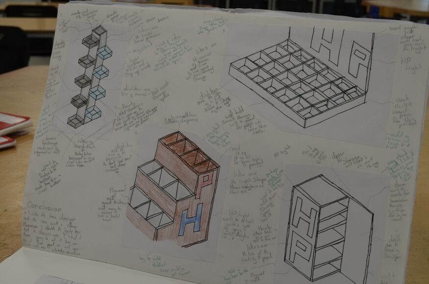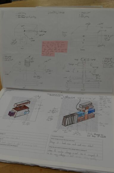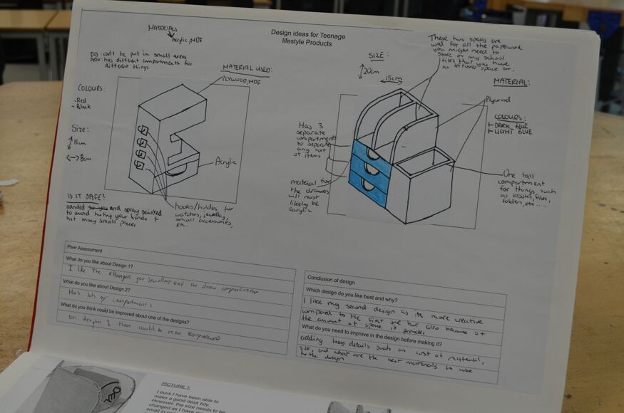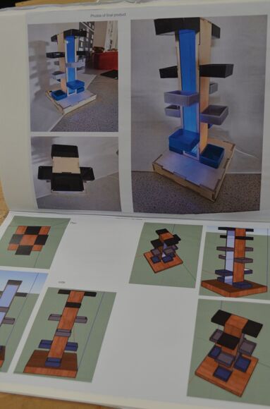 Emily designed a jewellery stand with a plywood drawer and different shades of blue acrylic. With lighting in the central tower, she managed to create an eye-catching graduated effect, with the light bright near the base.