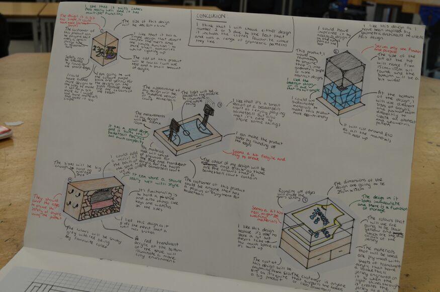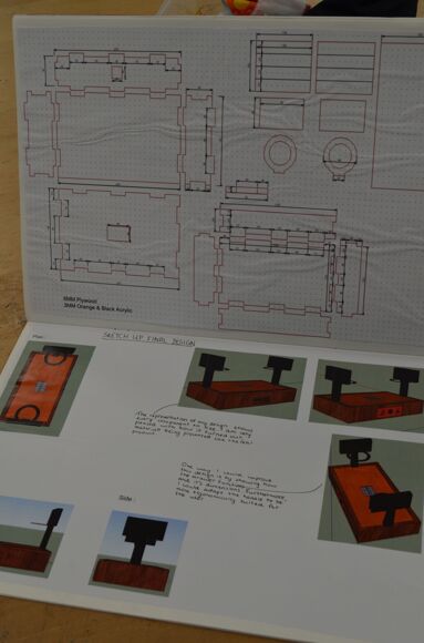 Ben chose to imagine a client with a keen interest in basketball. He designed a storage unit to look like a court, with laser-cut black acrylic for the nets. His drawer in the base was carefully considered, to conceal and protect all of the wiring for safety.