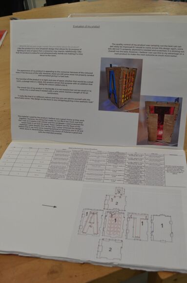 Alexander wanted to design a portable light, and accomplished this with a plywood tower using finger joint construction. He included three translucent sides in different colours, with geometric shapes to give as much light exposure as possible.