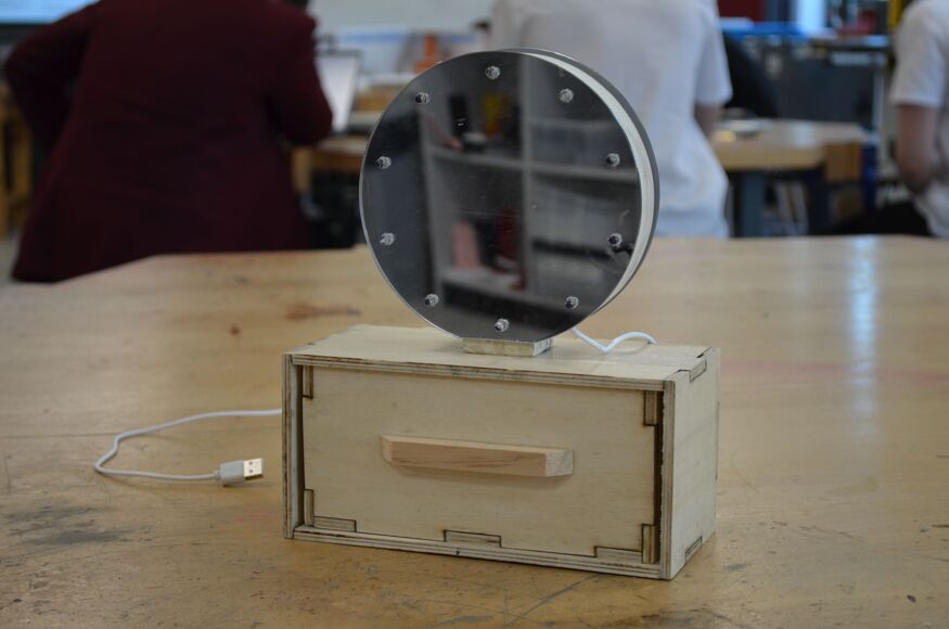 Vasilija's product was designed to store jewellery, with the addition of a circular acrylic mirror containing individual LED lights which cycle colour on a diode. The lighting choice is extremely effective against the mirrored background.