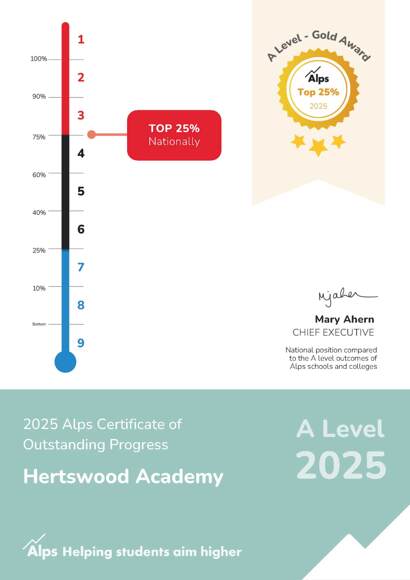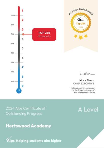 For the second consecutive year, Miss McFerran and the Sixth Form Team were delighted to receive recognition from Alps confirming that Hertswood's Year 13 results were in the top 25% in the country for progress!